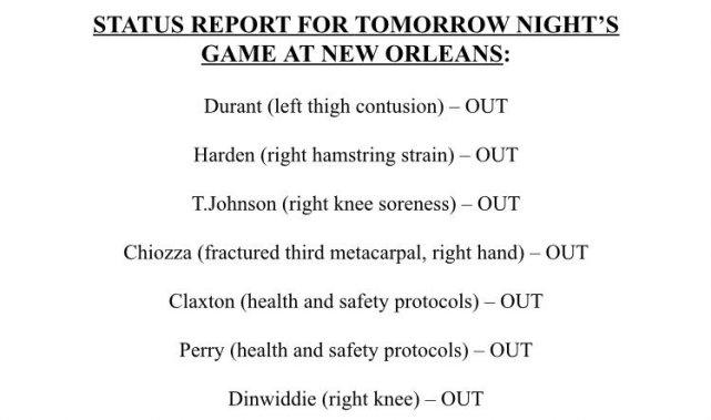 来源:24直播网04-20 16:2424直播网讯 北京时间4月20日,篮网官方公布了明天客场对鹈鹕的伤病名单,多达七名球员被贴上了OUT(缺席)的标签。杜兰特(左大腿挫伤)、哈登(右腿筋拉伤)、泰勒-约翰逊(右膝酸痛)、齐奥扎(右手骨折)、克拉克斯顿(健康安全协议)、佩里(健康安全协议)、丁威迪(右膝伤病)都不能出战这场比赛。这意味着欧文将单核带队来打这场比赛。