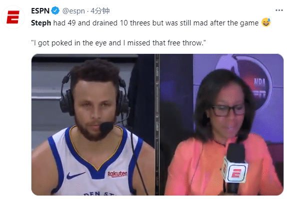 赛后库里表示自己很生气,原因是他错过一罚球,结果与50+擦肩而过;库里表示遗憾:我错失了罚球。