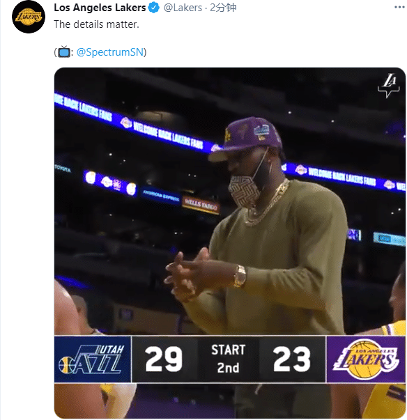 湖人首节23-29暂时落后爵士6分,第二节开打之前,詹姆斯走到湖人替补席,代替沃格尔变身湖人主教练,双手演示防守动作,指导众队友;36岁詹姆斯戴着一顶紫色棒球帽,戴着手表以及好几串钻石项链,穿金戴钻太奢华,土豪詹教练上线了。