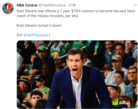 来源:24直播网04-18 15:3024直播网讯北京时间4月18日,据ESPN名记沃纳罗斯基报道,凯尔特人主帅布拉德-史蒂文斯拒绝了一份来自印第安纳大学7年7000万美元的主教练合同;少帅拒绝7年7000万美元大合同,年薪高达千万美元,目前史蒂文斯年薪不详,去年他和球队达成提前续约合同。