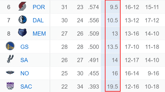 因此,勇士要力争排名第7或者第8,这样等于在附加赛里拥有“两条命”。现在,排在第7的独行侠有一定的优势,他们领先第8的灰熊2.5个胜场。和勇士在排名方面构成主要竞争关系的主是灰熊、马刺、鹈鹕这3支球队,排在第12位的国王目前9连败,已经渐渐没有竞争附加赛名额的希望。