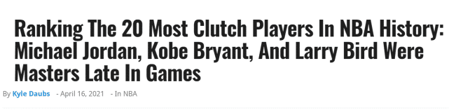来源:24直播网04-17 16:1324直播网讯 北京时间4月16日,美媒Fadeaway World(FW)评选NBA历史上的20大关键先生,乔丹无悬念排名第一,科比位居第二,詹姆斯排名第四。现役球员中,一共有6人出现在这份榜单上。