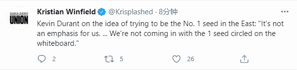 谈到东部第一的话题,杜兰特表示东部第一不是他们的重点,他们不在乎东部第一,东部第一不是我们白板上的目标。