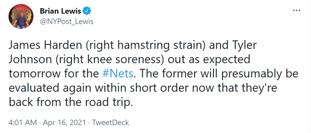 来源:24直播网04-16 15:3824直播网讯北京时间4月16日,篮网公布了明日对黄蜂一战的伤病名单。哈登(右腿筋拉伤)和泰勒-约翰逊(右膝酸痛)将缺席比赛,掌骨骨折的齐奥扎和十字韧带部分撕裂的丁威迪也不会出场。哈登受伤时,篮网曾宣布他将在10天后接受复查,对黄蜂一战正好是第10天,他已经确定缺席这场比赛,具体回归时间有待新的评估。