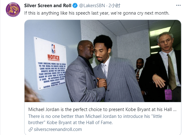 对于乔丹担任科比名人堂引荐人这件事,美媒Sliver screen and Roll发推写道:如果乔丹像去年那样讲话,下个月我们又要哭了。