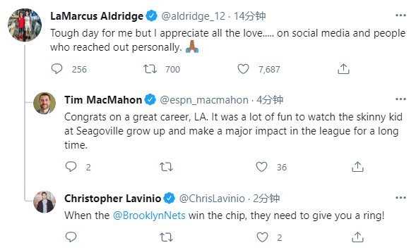 阿德感谢所有人的祝福,名记蒂姆-麦克马洪回应:恭喜你阿德,伟大的职业生涯,看着你这个骨瘦嶙峋的孩子长大,并且在联盟产生重大的影响;另一记者则写道:当篮网今年夺冠时,他们需要给你一枚总冠军戒指。