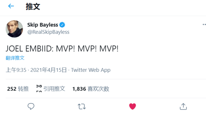 这其中就包括名记skip bayless,他连发3个MVP支持恩比德!虽然目前约基奇在MVP榜上排名第一,但如果大帝能将这种表现延续到常规赛结束,他显然是有机会完成反超的,毕竟这赛季恩比德确实打得非常稳定,在内线的统治力肉眼可见。