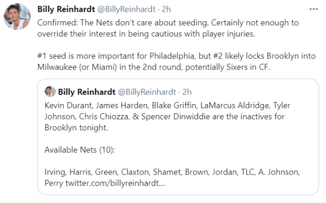 Reinhardt认为篮网大面积安排球员休息,意味着他们并不在意最终的排位,至少兴趣没有超过他们对球员伤病的谨慎。或许对费城而言,锁定东部一号种子更重要。如果篮网排名东部第二,他们很可能会在第二轮碰到雄鹿(或者热火),有可能和费城在东决碰面。