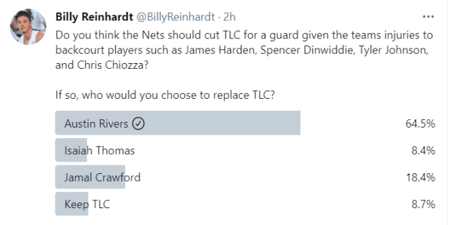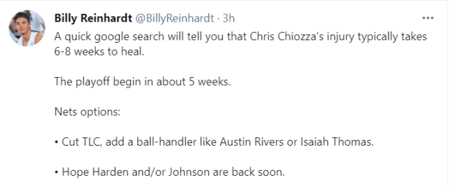 篮网目前最大的问题,是后场缺人,虽然欧文复出了,但他们在上一场比赛失去了替补控卫齐奥扎。Reinhardt指出,齐奥扎的伤病预计休战6-8周,而季后赛将在5周后开始。篮网目前的选项:其一,裁掉卡巴罗特,增加一个像小里弗斯或者小托马斯这样的控球手;其二,希望哈登或者约翰逊能够尽快复出。