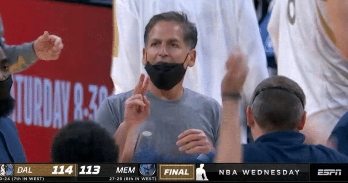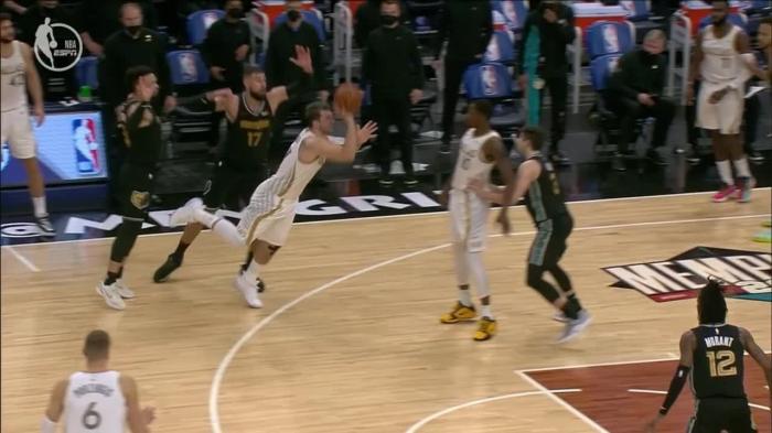本场比赛,东契奇上场34分钟,20投10中、三分10投3中轰下29分9助攻5篮板2抢断1盖帽,外线手感不佳,但终场前1.8秒,东契奇神奇压哨三分绝杀灰熊;绝杀后东契奇咧嘴大笑,高举双手庆祝胜利,当时库班伸出两根手指,愣神不知道是两分还是三分,裁判回放确定这是三分压哨绝杀。
