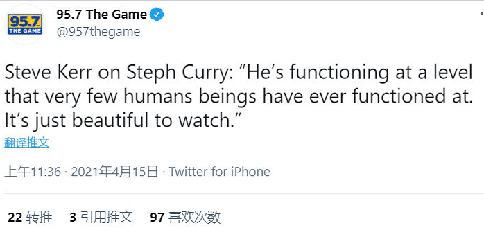 这场比赛库里确实打得太轻松了,他三节打卡,同时在中场休息时候,更衣室的库里还玩手机刷社交媒体,这还是NBC湾区记者Liffmann在本场比赛进行到中场休息的时候称赞库里的表现,而库里很快就进行了点赞,点赞的时间就是在中场休息的时候。