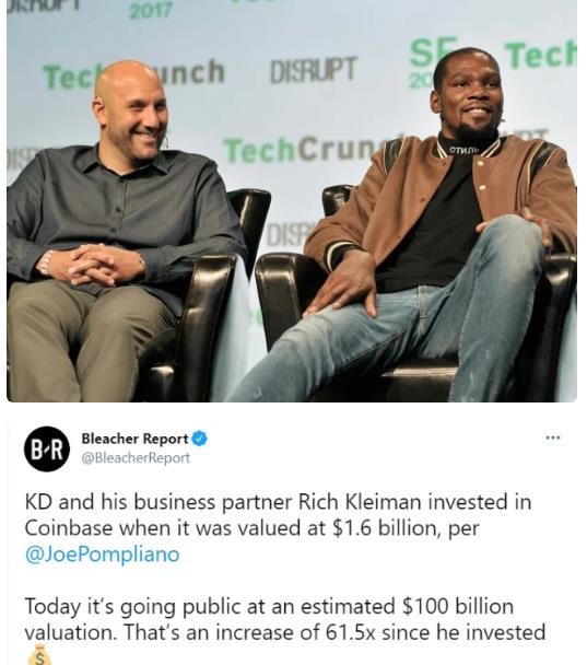 在得到橄榄枝后,杜兰特毫不犹豫地拿出了小猪存钱罐,以他和经纪人瑞奇.克莱曼创办的Thirty Five Ventures公司的名义向Coinbase投资了25万美元。25万美元,也就是杜兰特一场比赛的费用,可是这笔投资却在近期为杜兰特带来了丰厚的收益。