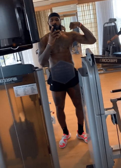 36岁詹姆斯带伤随队出征客场,照样闲不住,穿着黑色短裤并戴着头巾,泡在健身房里苦练,粗壮大腿和腹肌全都露出来;唱歌期间,詹姆斯狂秀二头肌,不过老詹有些忘词,略显尴尬。