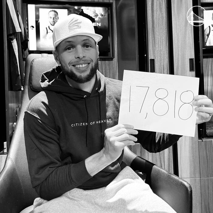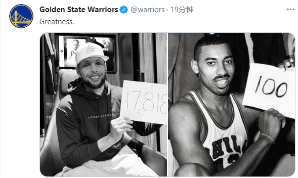 勇士官方晒出库里双手拿着一张写着17818(到目前为止,库里已经在勇士拿到17818分,队史得分第一人)的纸张的照片,向张伯伦致敬,张大帅曾单场轰下100分,手持写着100的纸张神照早已成为经典;勇士官推写道:伟大!