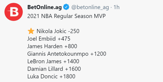 来源:24直播网04-13 11:3824直播网4月13日讯 北京时间4月13日,2021年常规赛MVP的最新赔率出炉,约基奇(-250)继续领跑,而且扩大了领先优势。恩比德(+475)排名第二,哈登(+800)位居第三。排名第4-7位的依次是字母哥(+1200)、詹姆斯(+1400)、利拉德(+1600)和东契奇(+1800)。
