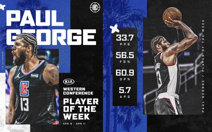乔治上周出战三场比赛,场均能够得到33.7分5.7助攻,投篮命中率56.5%、三分命中率高达60.9%,快船取得了4胜0负的战绩;乔治连续三场30+,三场得分依次是对阵开拓者36分,对阵太阳33分和对阵活塞32分,凭借出色的表现,乔治当选西部周最佳球员。