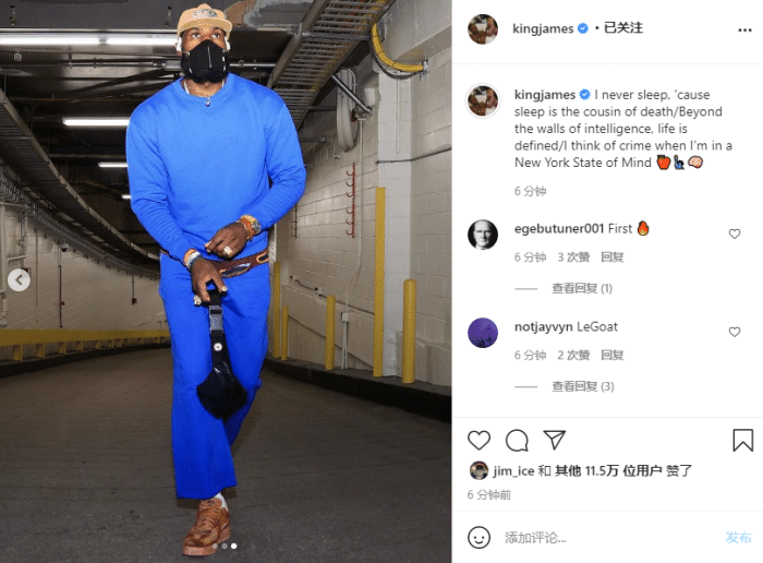 詹姆斯晒入场照的同时,还在社交媒体上写道:我从不睡觉,因为睡眠是死亡的表兄弟以及超越智慧的墙,生命是有定义的,当我全神贯注于纽约时,我会想到犯罪。