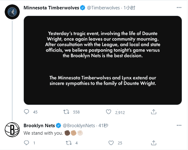 森林狼官宣声明之后,篮网官方在评论区留言:我们支持你(三个握拳表情);篮网和森林狼原定于今天的比赛,被推迟到明天进行。