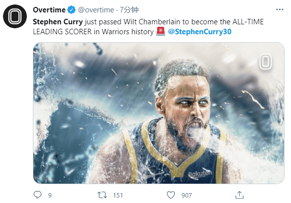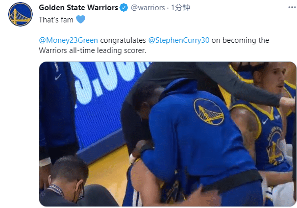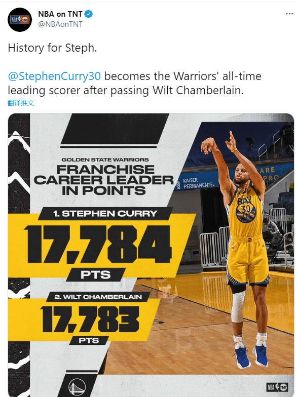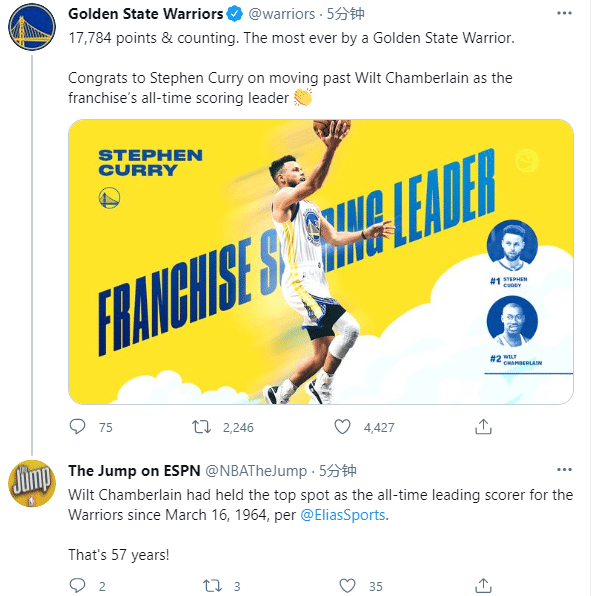 勇士官推晒照并且写道,恭喜库里正式超越张伯伦成为队史得分王;据统计,张伯伦在19年64年成为勇士得分王,如今库里打破尘封57年之久的历史纪录,成为勇士队史得分第一人。