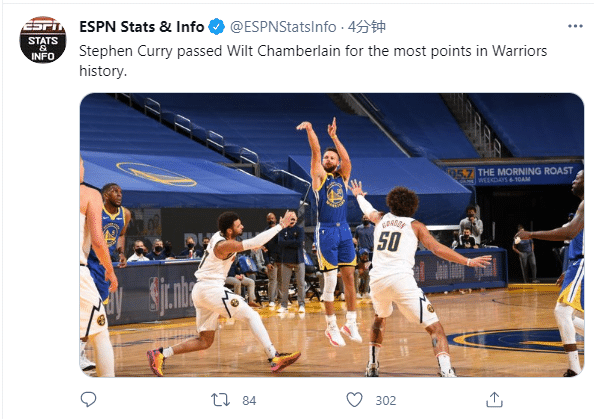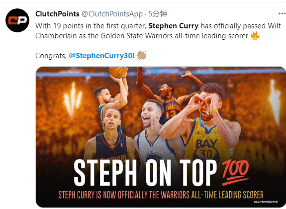 库里首节打满12分钟9投6中高效轰下21分,单节20+太疯狂,因此库里常规赛总得分达到17786分,从而正式超越张伯伦(17783分)成为勇士队史得分第一人,随后此事瞬间冲上热搜引热议,勇士官方以及众美媒疯狂晒图庆祝。