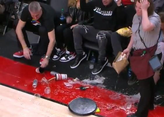 众所皆知,NBA球馆是禁止自己带饮料进入,所以提供啤酒、饮料、花生、矿泉水成为了球馆服务的一部分,而相比于给其他区域的客人送货,给VIP的场边观众送货就充满了风险,因为她们可能随时会被球员或者裁判撞倒。