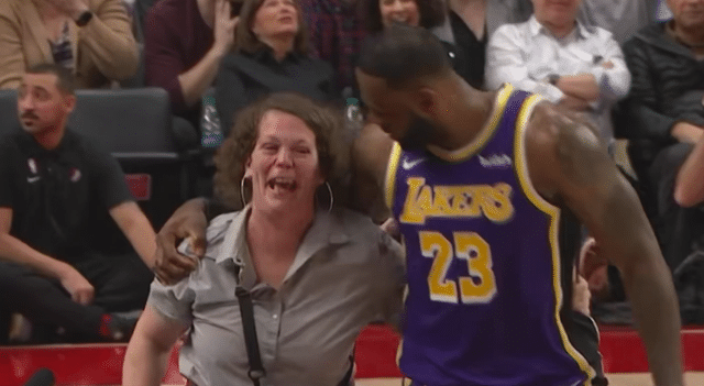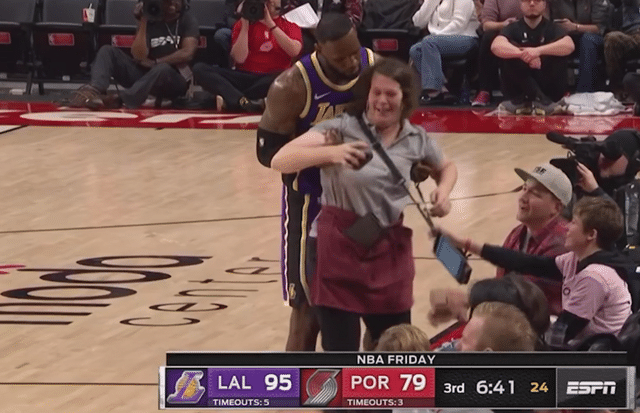 2019年12月7日,湖人队客场挑战开拓者,比赛进行到第三节还剩下6分多钟的时候,詹姆斯在回防的时候不小心撞到了场边卖啤酒的大妈,看着满地的酒水,倒地的大妈一脸的无奈和委屈。