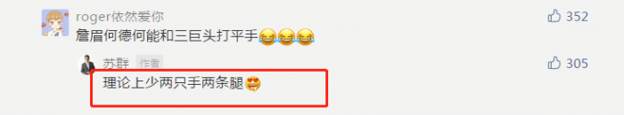 而有球迷在社媒上表示,“詹皇何德何能和三巨头打成平手”,该球迷还配上三个笑哭的表情。而苏群老师回应,“理论上少两只手两条腿”。