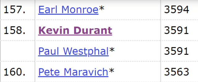 第二,杜兰特的生涯助攻数也有望超越两大名宿。目前他的助攻累计达到3591次,和韦斯特法尔并列第158位,只要他本战有助攻,就能超越韦斯特法尔。如果他送出4次助攻,就能超越排在第157位的厄尔-门罗(3594次)。杜兰特赛季至今的20场比赛,有16场至少送出4次助攻。