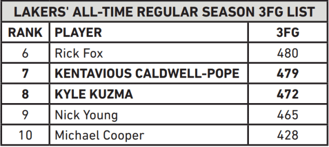 湖人一方,波普也有望提升自己在湖人队史上的三分排名。目前,波普已经为湖人投中479个三分球,排名湖人队史第7位,而排在第6位的是里克-福克斯(480个)。波普只要在对篮网的比赛里命中两记三分,就能超越福克斯,升至队史第6位。