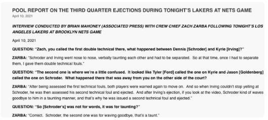 施罗德开始还击欧文,双方也快亲到了一起,不过相比情绪激动的欧文,施罗德高高举起双手,面带微笑,随后裁判隔开了两人,并给了两人一个技术犯规。可正当现场进行冲突回放的时候,欧文被罚出场外了。