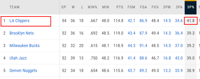 来源:24直播网04-10 19:0824直播网讯北京时间4月10日,快船主场126-109击败火箭。本场比赛,快船三分球37投19中,再次展露了外线的实力。赛季至今,快船的三分命中率达到41.8%,排名联盟第1,而且是唯一一支三分命中率超过四成的球队。
