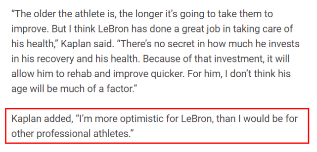 当然,年龄和恢复密切相关。卡普兰表示:“通常运动员年龄越大,需要的恢复时间越长,不过我认为詹姆斯在照顾自己身体方面很出色,他每年花在健康上的费用是公开的秘密,由于这些投资,他的恢复会更快,所以对他来说,年龄就不是太大的问题了。”卡普兰还补充道:“相比其他(受伤的)职业运动员,我对詹姆斯感到更加乐观。”