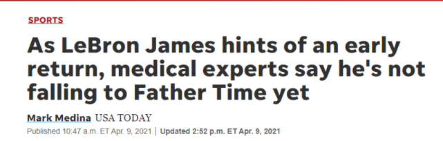 Mark Medina最后表示,如果The Athletic之前报道的复出时间无误,詹姆斯有望在当地时间4月16日-4月30日之间回归,而湖人5月份还有9场常规赛,届时,詹姆斯可以在季后赛到来前再热热身。