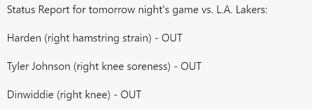 篮网官方也公布了对湖人一战的伤病名单。沙梅特已经不在名单上,纳什表示这位射手有望在对湖人一战中出场。确定缺阵的只有3人:哈登、泰勒-约翰逊和丁威迪。