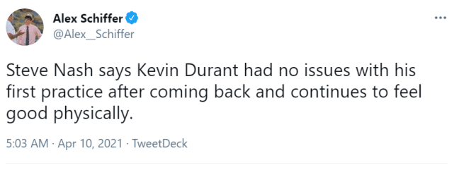 照片上,杜兰特又戴上了心爱的小红帽,这是他在投篮训练中常有的配备。主教练纳什在训练后的采访中表示,杜兰特复出后的第一次训练没有出现任何问题,身体方面,他仍然感觉很好。