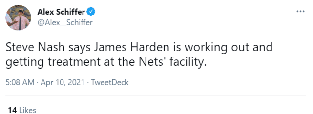 纳什透露,因腿筋拉伤要在一周后再次评估的哈登,今天也来到了球馆。他进行了一些轻量训练,并接受了治疗。哈登的腿筋是一级拉伤,并不算严重,但篮网出于谨慎角度考虑,很可能会让他多休息一段时间。毕竟,篮网目前的状态很好,战绩也很出色,没必要让哈登冒这个险。