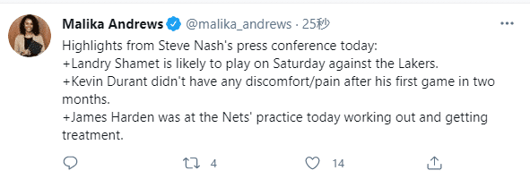 纳什也透露哈登的伤愈进展,目前哈登正在接受治疗,进行了康复训练。