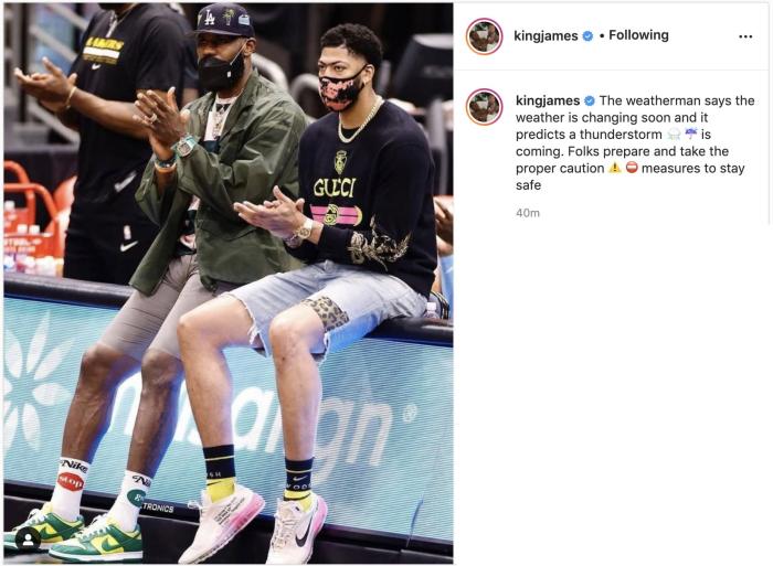 詹姆斯更新社媒媒体,在Ins上更新动态,晒出自己和浓眉坐在场边的合影,写道:天气预报显示马上就要变天了,预报说雷暴天气马上就要来了#大雨#雨伞。大家做好准备并做好安全防范措施!#警告