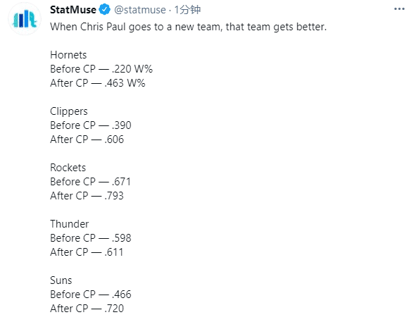 美媒更是列出保罗对一支球队的影响了——保罗加盟后,黄蜂胜率从22%变成46.3%;快船胜率从39%变成60.6%;火箭胜率从67.1%变成79.3%;雷霆胜率从59.8%变成61.1%;太阳胜率从46.6%变成72%;如此数据便体现保罗的影响力,直接改变一支球队。