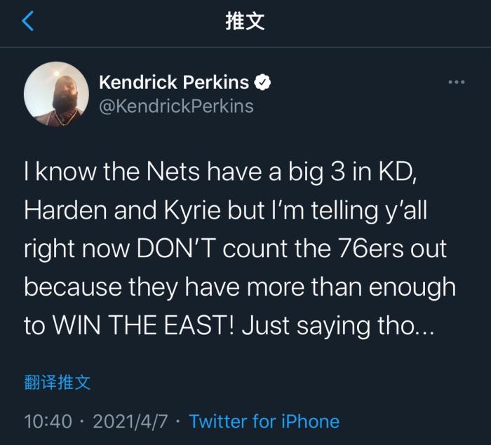 来源:24直播网04-07 19:4524直播网讯 北京时间2021年4月7日星期三上午,2020-2021赛季NBA常规赛,费城76人客场106-96战胜波士顿凯尔特人队。和篮网队战绩同为35胜16负,但是依靠着相互交手的优势成绩,重新回到东部第一的位置。而在比赛结束后,知名媒体人,前凯尔特人以及雷霆队中锋,名宿肯德里克-帕金斯却在推特里表示:“篮网三巨头杜兰特、哈登和欧文天下闻名,但是我想说,你们绝对不要忽视费城76人!他们现在有足够的能力冲出东部!”