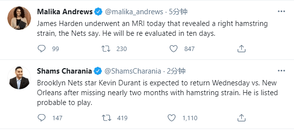 哈登遭遇腿筋拉伤至少伤停10天,与此同时,名记报道杜兰特很有可能下一场对阵鹈鹕复出,时隔将近两个月或首发复出。