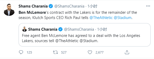 来源:24直播网04-07 16:1024直播网讯湖人卫冕终极阵容诞生,据名记shams报道,湖人将签约神射本-麦克勒莫,双方已经达成签约协议;此前他被火箭裁掉;麦克勒莫的经纪人里奇-保罗已经证实了这一消息,麦克勒莫将在剩余赛季都会为湖人效力。