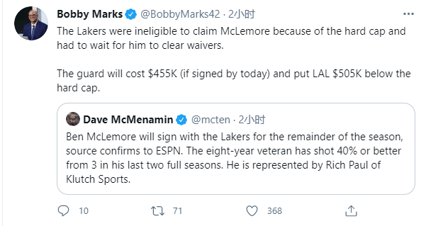 据名记Bobby Marks报道,湖人签下麦克勒莫将花费45.5万美元,距离硬工资帽还差50.5万美元;由于受到硬工资帽的限制,湖人无法直接认领麦克勒莫,只能等到他度过澄清期,然后和麦克勒莫签约。