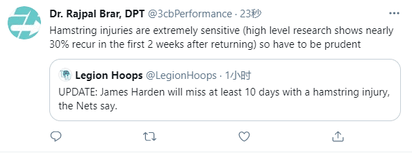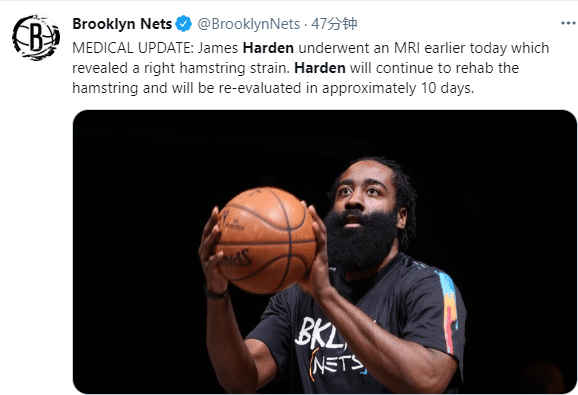 杜兰特复出将近,但哈登的腿筋拉伤了,伤势严重程度暂不可知;对于哈登的伤势,医学专家发推写道:腿筋拉伤是非常敏感的,复出的前两周有30%的复发可能性,所以篮网必须谨慎。