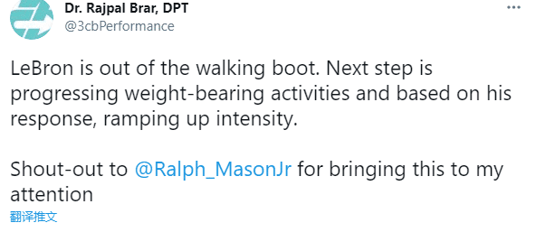 詹姆斯已经取得伤愈的重大一步,据医学专家分析,詹姆斯已经不再穿着保护靴,他的下一步是进行负重康复训练,并根据他的反应来加大训练强度。