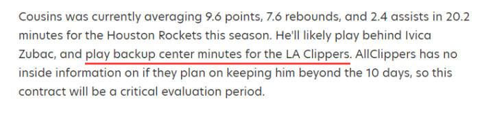 考辛斯再次和朗多成为队友,不过30岁全明星中锋仅仅只拿十天短合同,这份合同将是一个关键评估期;若考辛斯表现好的话,他有可能继续留在快船,否则的话,考辛斯有可能再次失业。