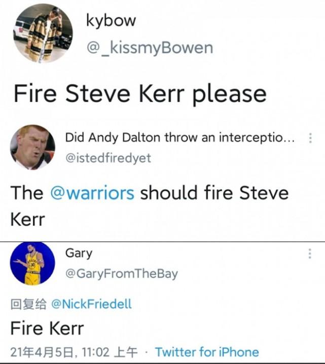 勇士目前23胜27负,排名西部第10位,只领先身后的鹈鹕0.5个胜场,再输下去,他们可能连参加附加赛的资格都无法确保了。已经有很多球迷在社媒上喊出“炒掉科尔”的口号。
