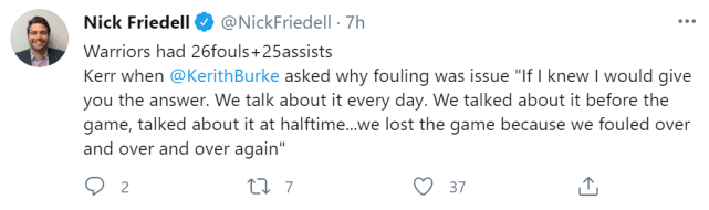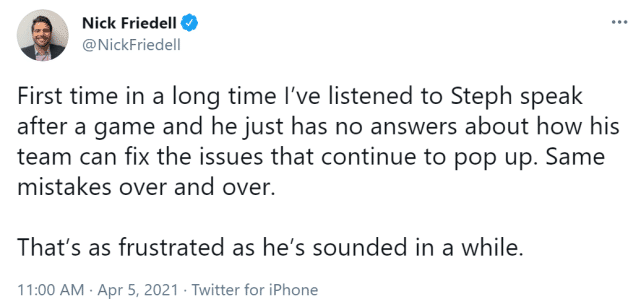赛后,空砍37分的库里在接受采访时一脸沮丧。勇士名记Nick Friedell表示库里很久没这么无奈。Friedell在社媒上写道:“很长时间以来,我第一次听到库里赛后无法回答他的球队如何解决不断出现的问题。同样的错误一直反复。”