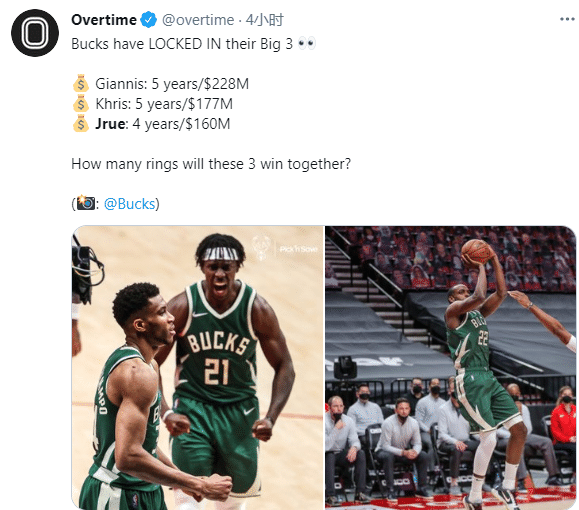 雄鹿狂砸1.6亿美元提前续约霍勒迪,这意味着他们已经确定未来3-4年的冲冠核心,换句话说雄鹿已经打造三巨头——字母哥5年2.28亿美元、米德尔顿5年1.78亿美元和霍勒迪4年1.6亿美元,雄鹿拥有三位拿着亿元合同的顶薪全明星球员。
