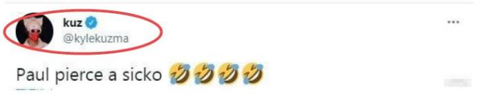 不得不说,皮尔斯的这一出还算挺成功的,他成功的抢回了不少的关注度,虽然球迷对于他的行为关注要大过于他直播的谈话内容,皮尔斯也再次上了热搜。不过对于皮尔斯的这种行为,湖人队的小将库兹马是看不下去了,他主动站出来怒怼皮尔斯:Paul pierce a sicko(保罗,一个道德败坏的人),库兹马的怒批也让很多球迷拍手叫好。